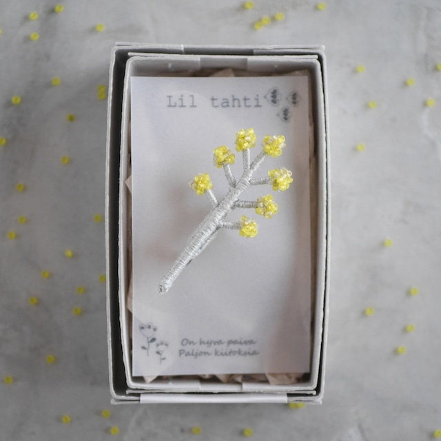 現在の発送状況はショップ情報に記載しておりますので、ご購入前にご確認下さい。 https://liltahti.theshop.jp/about 小さく丸いかわいい花を咲かせるミモザ。 そんなかわいらしいイメージをそのままデザインし、小ぶりのブローチに仕上げました。 針金に刺繍糸を丁寧に巻き付け、コロンと丸い花をイメージして光沢のない2種類のビーズを一つ一つ縫い付けてかわいらしさを表現しています。 軸部分はライトグレーの糸を使うことで、花部分を際立たせ上品な雰囲気に仕上げました。 シンプルなブラウスやワンピースに合わせてみてください。 特に白いブラウスに合わせるのがおすすめです。 普段使いはもちろんですが、 卒園式や入学式などのフォーマルも自分らしいファッションを楽しみたいナチュラルや北欧デザインがお好きな方にもおすすめです。 同じデザインのピアス/イヤリングもございます。↓ https://liltahti.theshop.jp/items/70761136 また、まとめ買いで送料が無料(¥8,000以上のご購入)になるので、合わせて同じシリーズのピアス/イヤリングはいかがでしょうか? お揃いでつけるとファッションにまとまりがでておすすめです。 オリジナルのBOXにいれてのお届けです。 ラッピングをご希望の方はオプションで無料ラッピングを選択してください。 通常ラッピングと母の日ラッピング、クリスマスラッピングの3種類ご用意しております。 ご自身へのご褒美や北欧デザイン、ナチュラルがお好きな方へのプレゼントに是非ご利用下さい。 また備考欄に『誕生日用』などご記入いただければhappy birthdayと記入された無料ラッピングをさせていただきます。 <素材> 刺繍糸、ガラスビーズ、金属(ブローチ金具) <カラー> モチーフ:ミモザイエロー×ライトグレー 金具:シルバー <サイズ> モチーフ:約5.8㎝×2.5㎝(手作りですので前後します) ※ご購入の際は下記の注意点を必ずお読み下さい。 ※お客さまの都合でのクレーム、返品、交換は受け付けておりませんのでご了承ください。 ※メッセージの返信は遅れる場合がございますのでご了承ください。 ※しっかりとした作りですが繊細な作品です。ひっぱったりしないよう優しくお取り扱いください。 ※イヤリング、ノンホールピアスをご希望のお客さまはオプションでイヤリング、ノンホールピアスをご選択下さい。選択がない場合は通常のピアスとなります。ご購入後の変更はできませんので、ピアスホールのない方はご注意ください。 ※ピアスをご購入のお客さま こちらはサージカルステンレスのピアスを使用しておりますが 金属アレルギーには個人差がございます。全ての方がアレルギー反応が出ないことを保証するものではございませんのでご注意ください。 ※ピンブローチ、ブローチをご購入のお客さまは金属アレルギーの場合、肌に触れないようご注意ください。 何か分からない点がございましたら、ご注文前にお気軽にお問い合わせくださいますようお願いいたします。