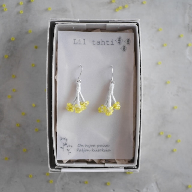 現在の発送状況はショップ情報に記載しておりますので、ご購入前にご確認下さい。 https://liltahti.theshop.jp/about 再販です。 小さく丸いかわいい花を咲かせるミモザ。 そんなかわいらしいイメージをそのままデザインし、小ぶりのピアス/イヤリングに仕上げました。 針金に刺繍糸を丁寧に巻き付け、コロンと丸い花をイメージして光沢のない2種類のビーズを一つ一つ縫い付けてかわいらしさを表現しています。 軸部分はライトグレーの糸を使うことで、花部分を際立たせ上品な雰囲気に仕上げました。 華奢で揺れるデザインは可憐な雰囲気を引き出してくれます。 シンプルないつものお洋服に合わせるだけでさりげなく華やかさをプラスしてくれます。 お揃いのブローチを合わせてつけると、卒園式や入学式などのフォーマルもまとまりのあるファッションを楽しんでいただけます。 どんなシーンも自分らしいファッションを楽しみたいナチュラルや北欧デザインがお好きな方にもおすすめです。 また、まとめ買いで送料が無料(¥8,000以上のご購入)になるので、合わせて同じシリーズのブローチはいかがでしょうか?↓ https://liltahti.theshop.jp/items/70727150 こちらの作品はアレルギーが出にくいサージカルステンレス製のピアス金具を使用しております。 ピアスホールのあいていない方はオプションでノンホールピアスをご選択ください。 選択がない場合はピアス(サージカルステンレス)になります。(万が一 間違いがあった場合は発送前であれば変更可能ですので、お申し付けください) オリジナルのBOXにいれてのお届けです。 ラッピングをご希望の方はオプションで無料ラッピングを選択してください。 通常ラッピングと母の日ラッピング、クリスマスラッピングの3種類ご用意しております。 ご自身へのご褒美や北欧デザイン、ナチュラルがお好きな方へのプレゼントに是非ご利用下さい。 また備考欄に『誕生日用』などご記入いただければhappy birthdayと記入された無料ラッピングをさせていただきます。 <素材> 刺繍糸、ガラスビーズ、針金、サージカルステンレス(ピアス、丸カン)、樹脂(ノンホールピアス) <カラー> モチーフ:ミモザイエロー×ライトグレー 金具:シルバー <サイズ> モチーフ: 約2.5㎝×1.5㎝(※モチーフ部分のサイズです。金具は選ぶ金具で異なります) ※ご購入の際は下記の注意点を必ずお読み下さい。 ※お客さまの都合でのクレーム、返品、交換は受け付けておりませんのでご了承ください。 ※メッセージの返信は遅れる場合がございますのでご了承ください。 ※しっかりとした作りですが繊細な作品です。ひっぱったりしないよう優しくお取り扱いください。 ※イヤリング、ノンホールピアスをご希望のお客さまはオプションでイヤリング、ノンホールピアスをご選択下さい。選択がない場合は通常のピアスとなります。ご購入後の変更はできませんので、ピアスホールのない方はご注意ください。 ※ピアスをご購入のお客さま こちらはサージカルステンレスのピアスを使用しておりますが 金属アレルギーには個人差がございます。全ての方がアレルギー反応が出ないことを保証するものではございませんのでご注意ください。 ※ピンブローチ、ブローチをご購入のお客さまは金属アレルギーの場合、肌に触れないようご注意ください。 何か分からない点がございましたら、ご注文前にお気軽にお問い合わせくださいますようお願いいたします。