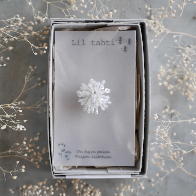 現在の発送状況はショップ情報に記載しておりますので、ご購入前にご確認ください。 https://liltahti.theshop.jp/about ビーズ刺繍のブローチです。 〜 〜 〜 〜 〜 〜 〜 〜 〜 〜 〜 凍てつくように寒い休日の朝 今日はぬくぬく家の中で過ごそう あったかいカフェオレ飲みながら ふと窓から外の様子を見ると 木の枝がキラキラ光ってる まるで氷の花が咲いたみたい いいものひとつ みつけた 〜 〜 〜 〜 〜 〜 〜 〜 〜 〜 〜 氷の花(霜柱)をイメージしてビーズを一つひとつ丁寧に立ち上がるように刺しています。 一つひとつ違うので世界にたったひとつをお楽しみください。 普段使いはもちろん、オケージョンにもおすすめのブローチです。 ブラウスやワンピに合わせたり、冬はニットに合わせるのも素敵です。 ナチュラルや北欧デザインがお好きな方におすすめです。 同じシリーズの色違いやピアス/イヤリング、タッセル付き2wayピアス/イヤリングもございます。 オリジナルのBOXに入れてのお届けです。 ラッピングをご希望の方はオプションで無料ラッピングを選択してください。 通常ラッピングと母の日ラッピング、クリスマスラッピングの3種類ご用意しております。 ご自身へのご褒美や北欧デザイン、ナチュラルがお好きな方へのプレゼントに是非ご利用ください。 <素材> リネン生地、タッセル用房糸、ガラスビーズ、金属(ブローチ金具)、フェイクレザー(裏側) <カラー> モチーフ:グレージュ 金具:ブラック系(変更する場合もございます) フェイクレザー:シャンパンゴールド(変更する場合もございます) <サイズ> モチーフ: 約2.5㎝×3.8㎝ ※手作りですので前後します。 ※ご購入の際は下記の注意点を必ずお読み下さい。 ※お客さまの都合でのクレーム、返品、交換は受け付けておりませんのでご了承ください。 ※メッセージの返信は遅れる場合がございますのでご了承ください。 ※しっかりとした作りですが繊細な作品です。ひっぱったりしないよう優しくお取り扱いください。 ※イヤリング、ノンホールピアスをご希望のお客さまはオプションでイヤリング、ノンホールピアスをご選択下さい。選択がない場合は通常のピアスとなります。ご購入後の変更はできませんので、ピアスホールのない方はご注意ください。 ※ピアスをご購入のお客さま こちらはサージカルステンレスのピアスを使用しておりますが 金属アレルギーには個人差がございます。全ての方がアレルギー反応が出ないことを保証するものではございませんのでご注意ください。 ※ピンブローチ、ブローチをご購入のお客さまは金属アレルギーの場合、肌に触れないようご注意ください。 何か分からない点がございましたら、ご注文前にお気軽にお問い合わせくださいますようお願いいたします。