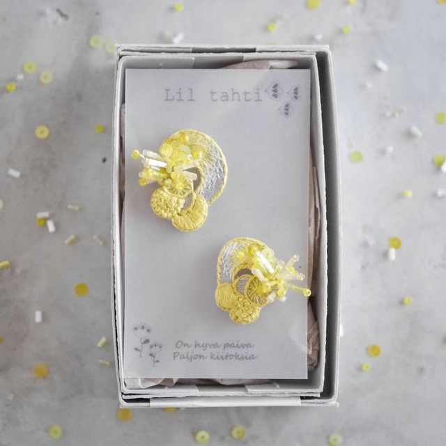 現在の発送状況はショップ情報に記載しておりますので、ご購入前にご確認下さい。 https://liltahti.theshop.jp/about こちらの作品は送料無料です。 小さく丸いかわいい花を咲かせるミモザ。 そんなミモザが花になるまでの道のりをイメージしてデザインしたピアス、イヤリングです。 リネン100%の生地に3色の糸とスパンコールそして4種類のビーズで表現しています。さまざまな手法の刺繍で変化をつけ、更に手法によって糸の本数を変えたり、ビーズを重ねるように刺したり、立ち上がらせて刺したりと、より立体的な作品に仕上げました。 右耳用と左耳用で少しずつデザインが違います。 アシンメトリーをお楽しみください。 右耳用が少し大きいデザインなので左右逆をご希望の場合は備考欄に「デザイン左右逆を希望」などご記入頂けますと左右逆でお作りします。 シンプルなブラウスやワンピースに合わせていただくと顔まわりがパッと華やぎます。 春の先取りにもぴったりのピアス、イヤリングです。 自分らしいファッションを楽しみたいナチュラルや北欧デザインが好きな方におすすめです。 色違いやブローチ、ピンブローチもございます。 アレルギー対応でピアスは変更なしでサージカルステンレスになります。キャッチもサージカルステンレスのベルキャッチ(内包シリコン)となっております。 ねじバネ式イヤリング(+¥100)と樹脂製ノンホールピアスへの変更はオプションをご選択ください。 選択がない場合は通常ピアス(サージカルステンレス)となります。(※注文後の変更はできませんのでご了承ください) ラッピングをご希望の方はオプションで無料ラッピングを選択してください。 通常ラッピングと母の日ラッピング、クリスマスラッピングの3種類ご用意しております。 ご自身へのご褒美や北欧デザイン、ナチュラルがお好きな方へのプレゼントに是非ご利用ください。 <素材> リネン100%生地、刺繍糸、ガラスビーズ、フランス製スパンコール、サージカルステンレス(ピアス、キャッチ)、フェイクレザー(裏側) <カラー> モチーフ:ミモザイエロー 金具:シルバー(サージカルステンレスピアス) ゴールド(イヤリング) フェイクレザー:シャンパンゴールド(変わる場合もあります) <サイズ> モチーフ:右耳用約3㎝×2.3㎝、左耳用約2.5㎝×2.3㎝(手作りですので前後します) ※ご購入の際は下記の注意点を必ずお読み下さい。 ※お客さまの都合でのクレーム、返品、交換は受け付けておりませんのでご了承ください。 ※メッセージの返信は遅れる場合がございますのでご了承ください。 ※しっかりとした作りですが繊細な作品です。ひっぱったりしないよう優しくお取り扱いください。 ※イヤリング、ノンホールピアスをご希望のお客さまはオプションでイヤリング、ノンホールピアスをご選択下さい。選択がない場合は通常のピアスとなります。ご購入後の変更はできませんので、ピアスホールのない方はご注意ください。 ※ピアスをご購入のお客さま こちらはサージカルステンレスのピアスを使用しておりますが 金属アレルギーには個人差がございます。全ての方がアレルギー反応が出ないことを保証するものではございませんのでご注意ください。 ※ピンブローチ、ブローチをご購入のお客さまは金属アレルギーの場合、肌に触れないようご注意ください。 何か分からない点がございましたら、ご注文前にお気軽にお問い合わせくださいますようお願いいたします。