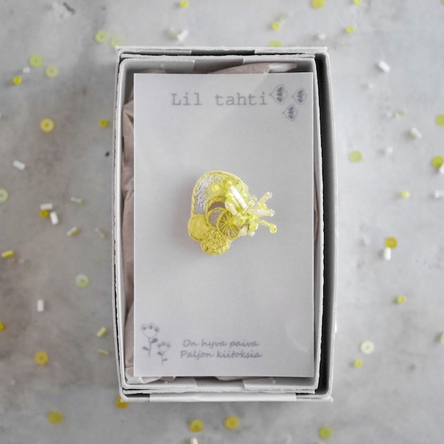現在の発送状況はショップ情報に記載しておりますので、ご購入前にご確認下さい。 https://liltahti.theshop.jp/about こちらの作品は送料無料です。 小さく丸いかわいい花を咲かせるミモザ。 そんなミモザが花になるまでの道のりをイメージしてデザインしたブローチです。 リネン100%の生地に3色の糸とスパンコールそして4種類のビーズで表現しています。さまざまな手法の刺繍で変化をつけ、更に手法によって糸の本数を変えたり、ビーズを重ねるように刺したり、立ち上がらせて刺したりと、より立体的な作品に仕上げました。 シンプルなブラウスやワンピースに合わせてみてください。 特に白いブラウスにがおすすめです。 自分らしいファッションを楽しみたいナチュラルや北欧デザインが好きな方におすすめです。 同じデザインのピアス/イヤリング、ピンブローチもございます。 オリジナルのBOXにいれてのお届けです。 ラッピングをご希望の方はオプションで無料ラッピングを選択して下さい。 通常ラッピングと母の日ラッピング、クリスマスラッピングの3種類ご用意しております。 自分へのご褒美や北欧デザイン、ナチュラルがお好きな方へのプレゼントに是非ご利用下さい。 <素材> リネン100%生地、刺繍糸、ガラスビーズ、フランス製スパンコール、金属 、フェイクレザー(裏側) <カラー> モチーフ:ミモザイエロー 金具:ブラック系(変わる可能性があります) フェイクレザー:シャンパンゴールド(変わる可能性があります) <サイズ> モチーフ:約4.5㎝×4.3㎝(手作りですので前後します) ※ご購入の際は下記の注意点を必ずお読み下さい。 ※お客さまの都合でのクレーム、返品、交換は受け付けておりませんのでご了承ください。 ※メッセージの返信は遅れる場合がございますのでご了承ください。 ※しっかりとした作りですが繊細な作品です。ひっぱったりしないよう優しくお取り扱いください。 ※イヤリング、ノンホールピアスをご希望のお客さまはオプションでイヤリング、ノンホールピアスをご選択下さい。選択がない場合は通常のピアスとなります。ご購入後の変更はできませんので、ピアスホールのない方はご注意ください。 ※ピアスをご購入のお客さま こちらはサージカルステンレスのピアスを使用しておりますが 金属アレルギーには個人差がございます。全ての方がアレルギー反応が出ないことを保証するものではございませんのでご注意ください。 ※ピンブローチ、ブローチをご購入のお客さまは金属アレルギーの場合、肌に触れないようご注意ください。 何か分からない点がございましたら、ご注文前にお気軽にお問い合わせくださいますようお願いいたします。