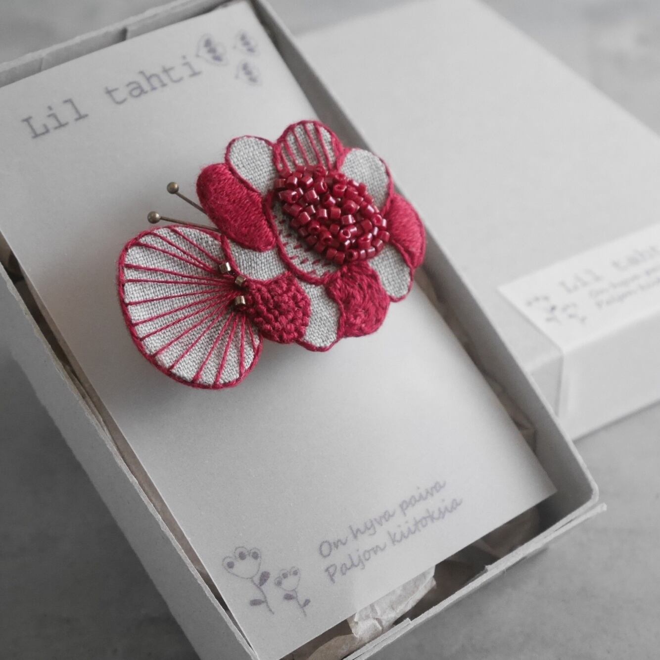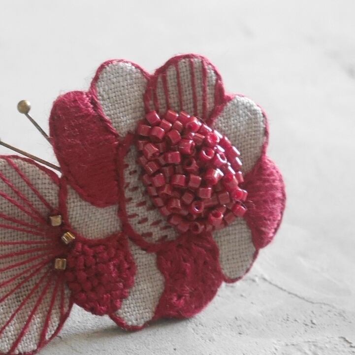 linen choucho刺繍ブローチ(ボルドー)【受注制作】