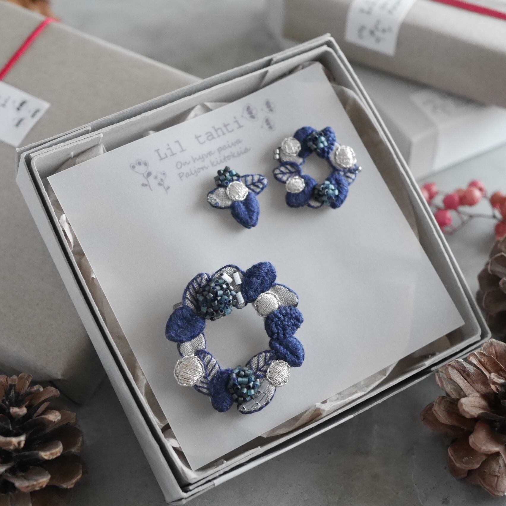 クリスマスありがとうセットlinen wreath刺繍ブローチandピアス/イヤリング(ネイビー)【受注制作】