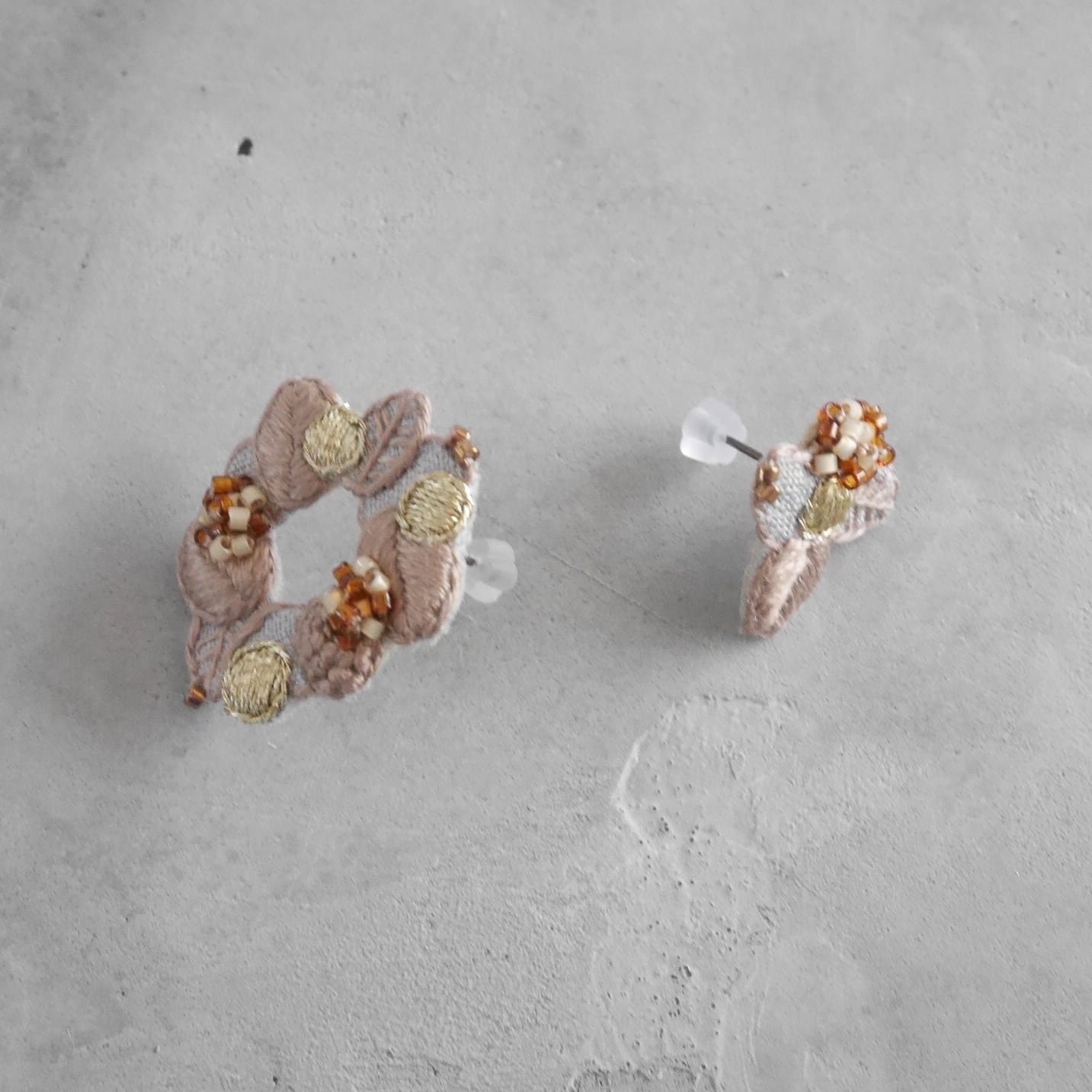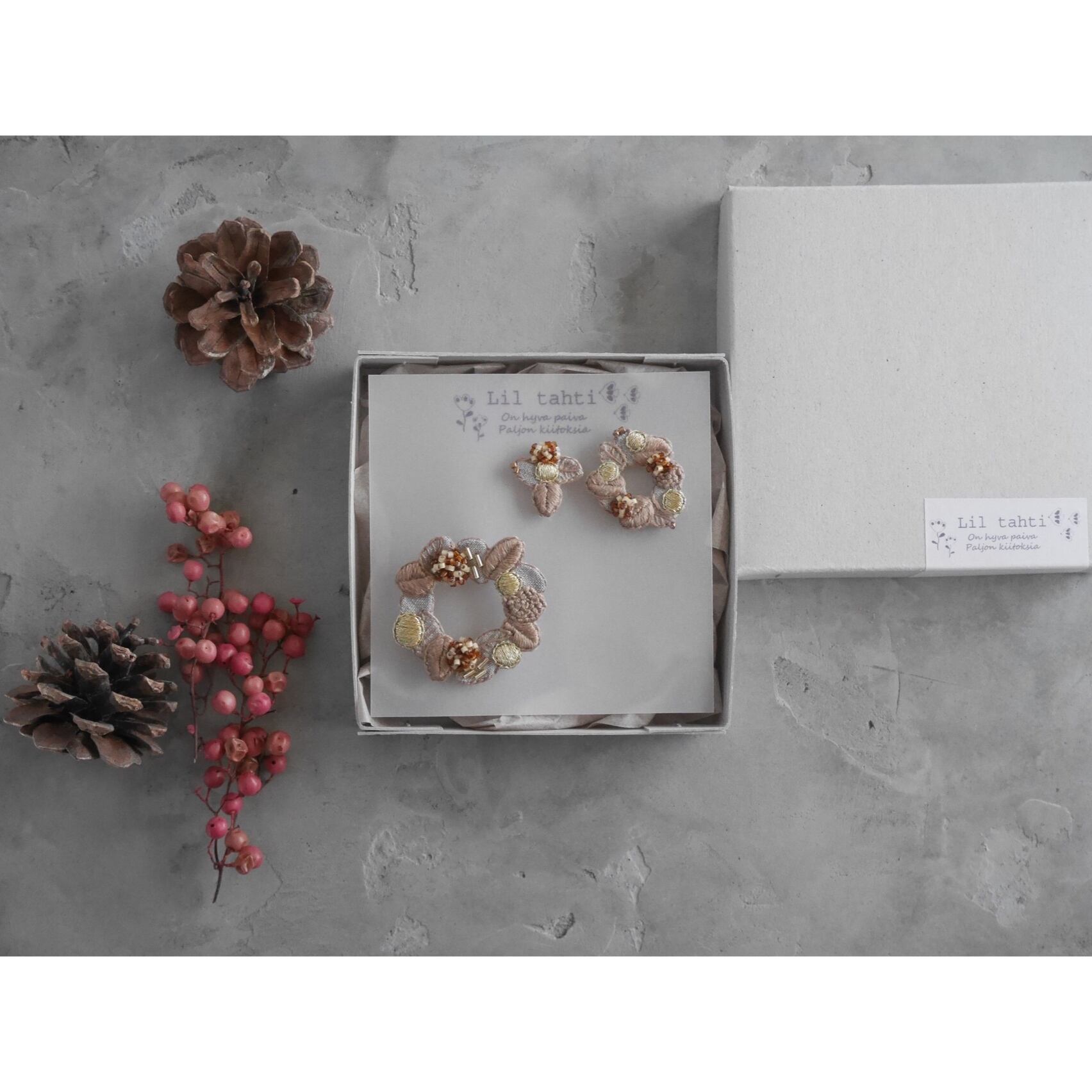 クリスマスありがとうセットlinen wreath刺繍ブローチandピアス/イヤリング(ベージュ)【受注制作】