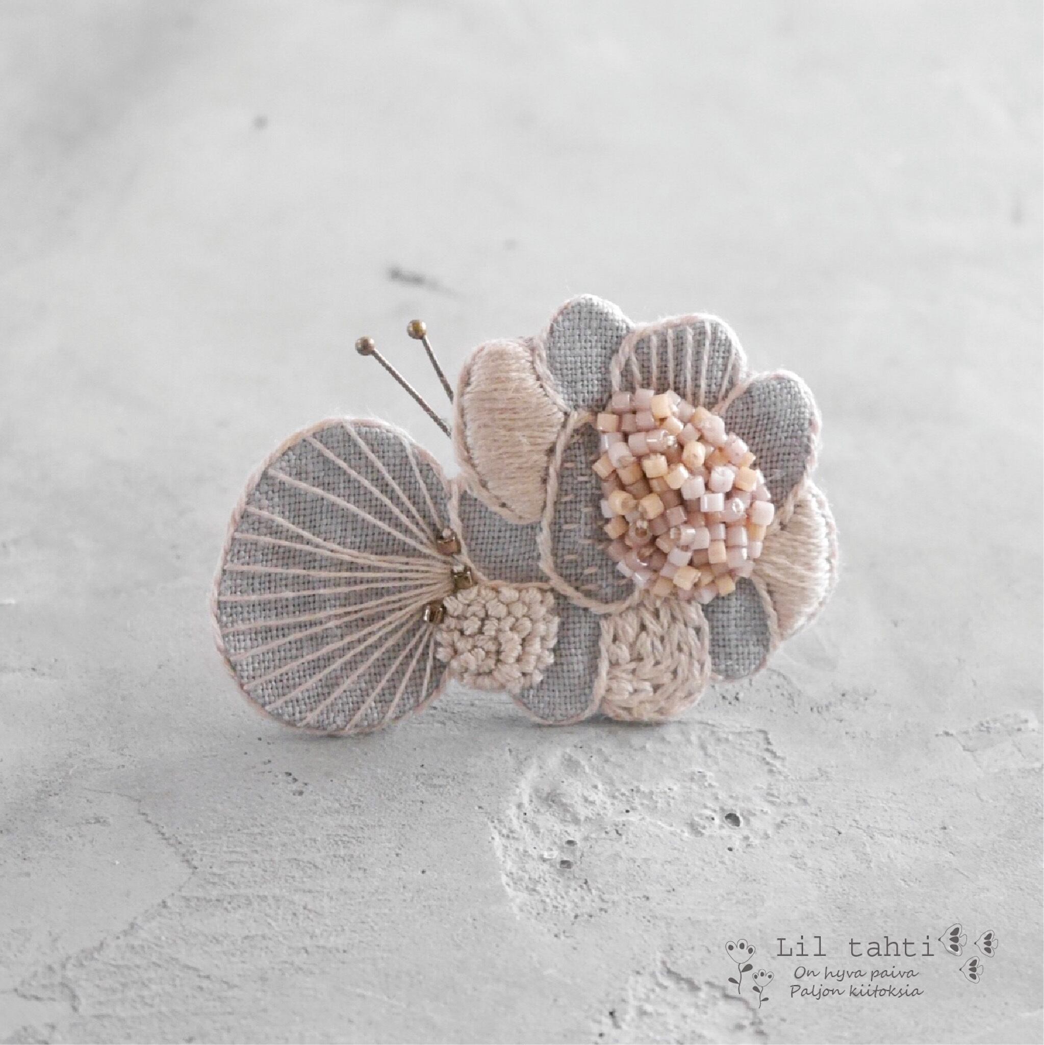 グレーのリネンを地の色に使っているのとピンクベージュの落ち着いたピンクで大人の女性に似合うちょうちょブローチです。