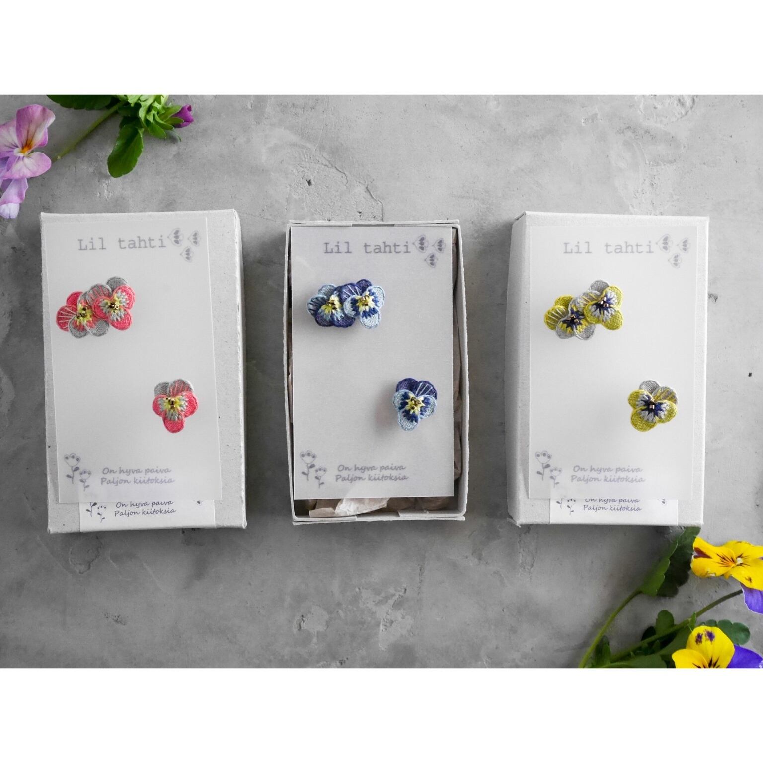 今回はそんなビオラをモチーフにした明るい色の作品を作りたいと思い、春色のピンブローチに仕上げました。