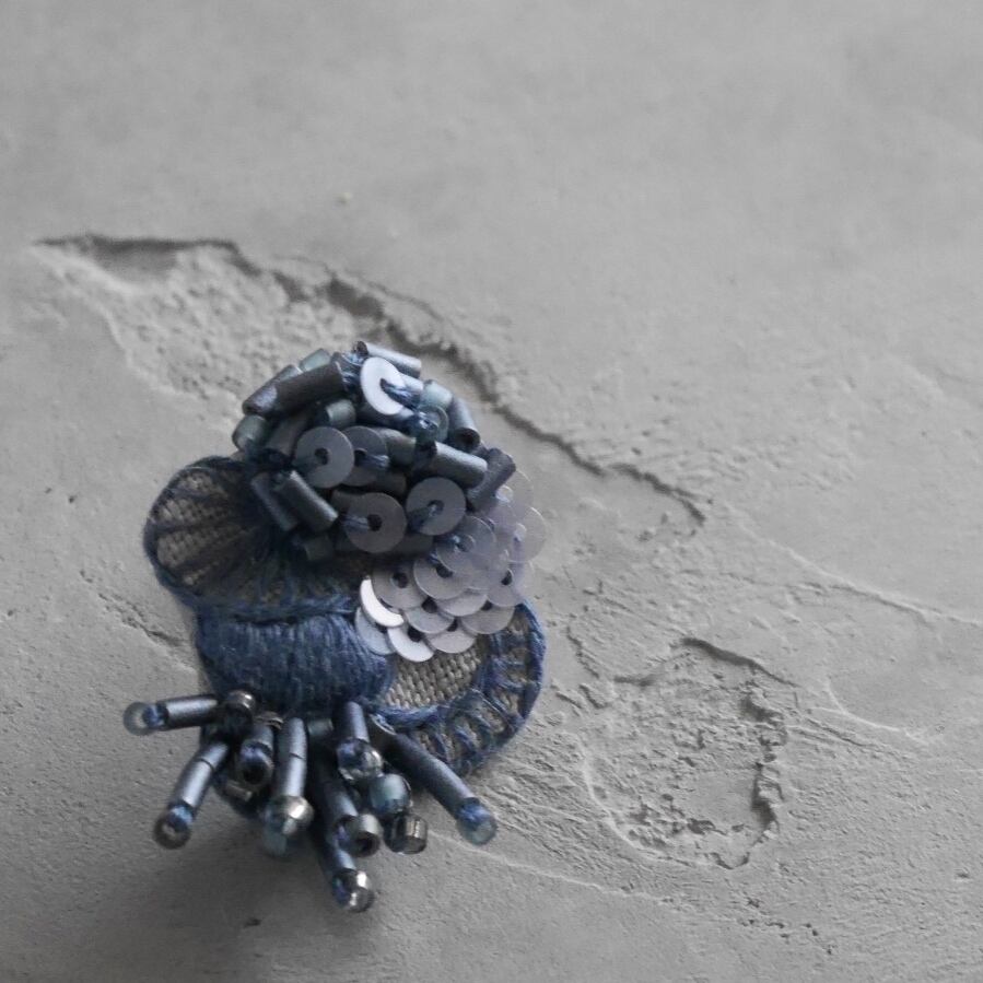 リネン100%の生地に1色の糸とさまざまな同系色のビーズで表現しています。