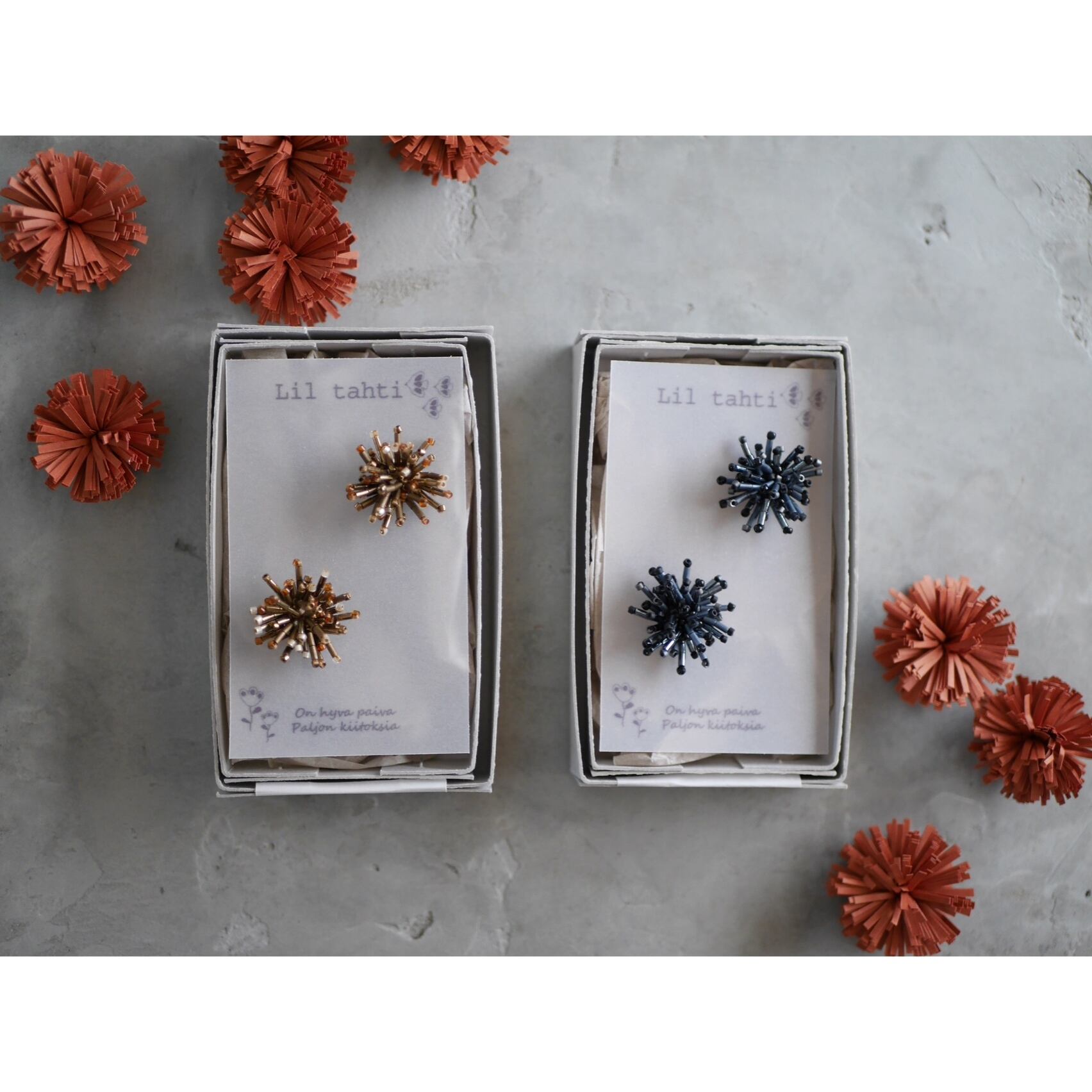 1つ1つ手作りしているので左右少しずつ形が違います。同じ形が1つとしてない手作りの良さを楽しんで頂けるピアス、イヤリングです。