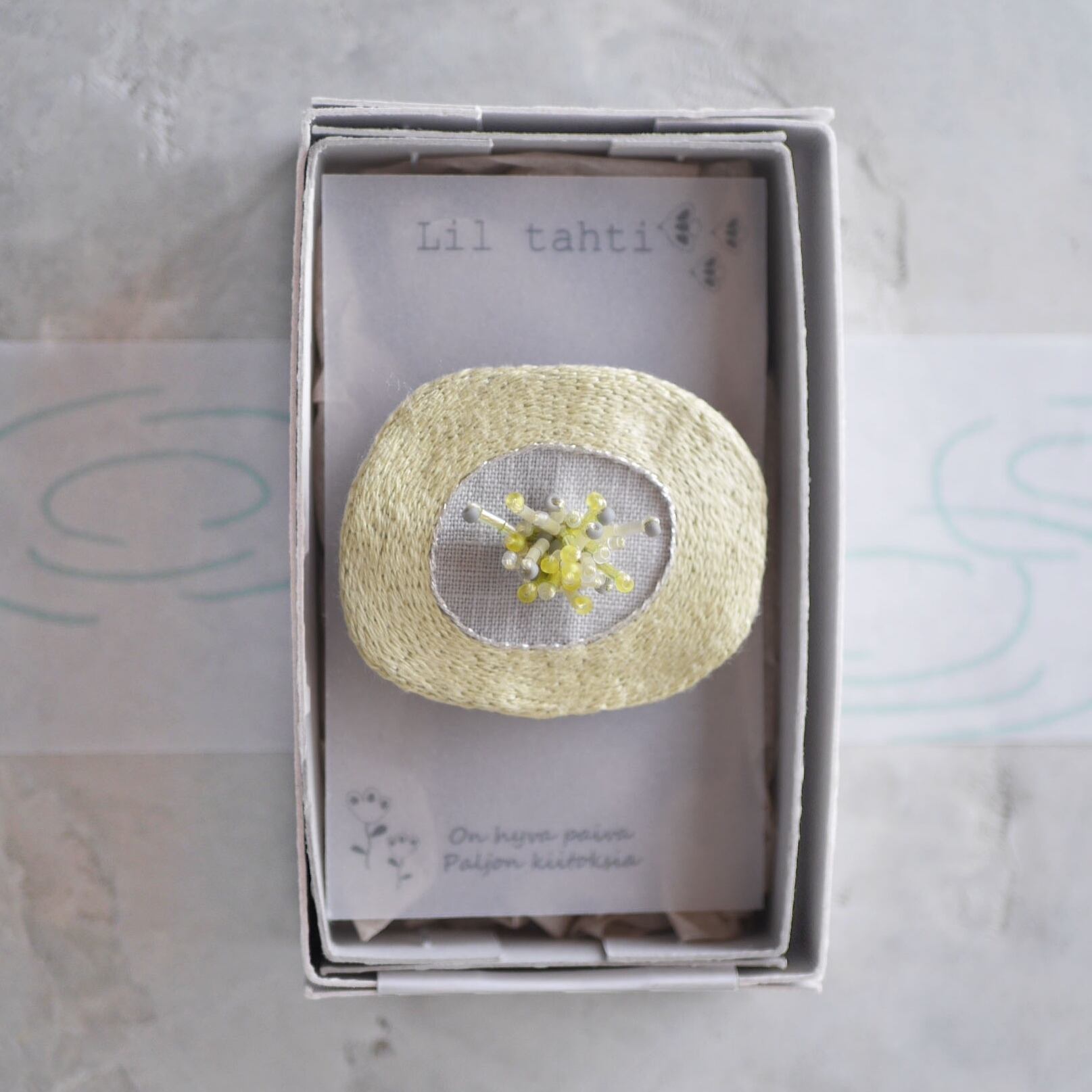 linen hanahamon刺繍ブローチ(ペールイエロー)【受注制作】
