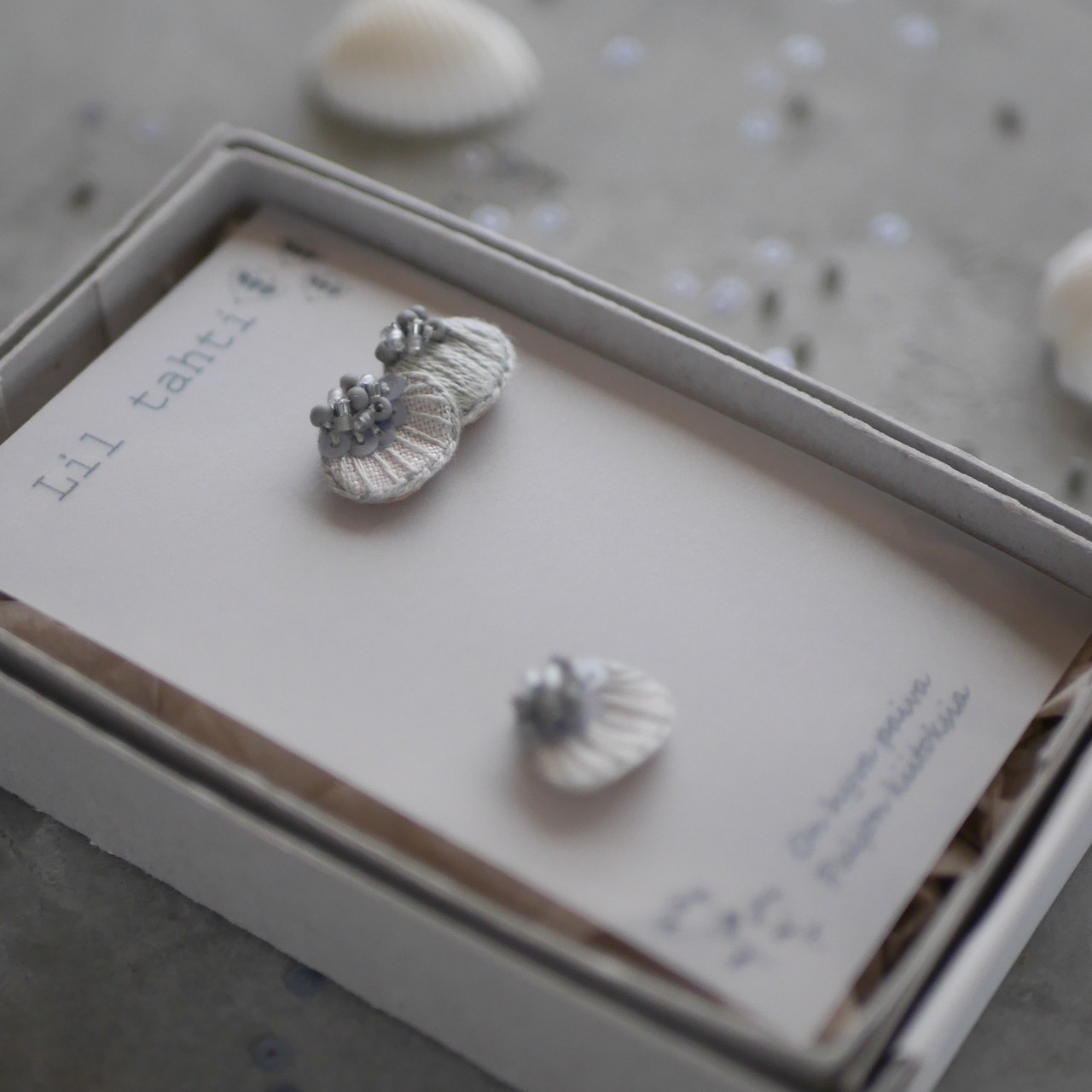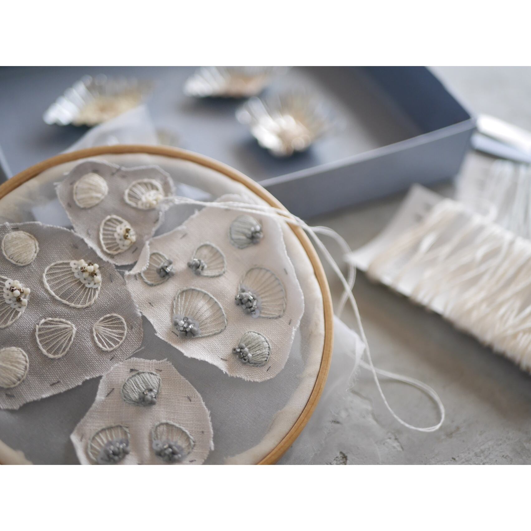 貝殻と花びらをイメージした刺繍ピアス/イヤリングです。