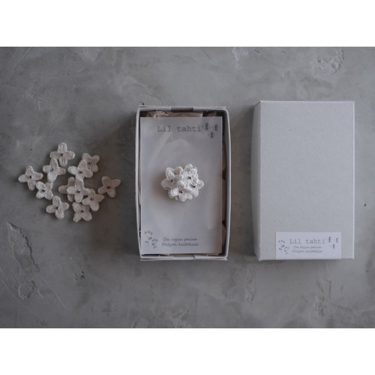 刺繍糸をリネン生地にひと針ひと針丁寧に刺した小さな花のパーツ。