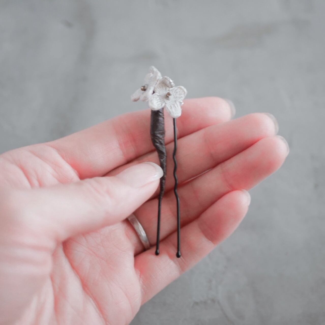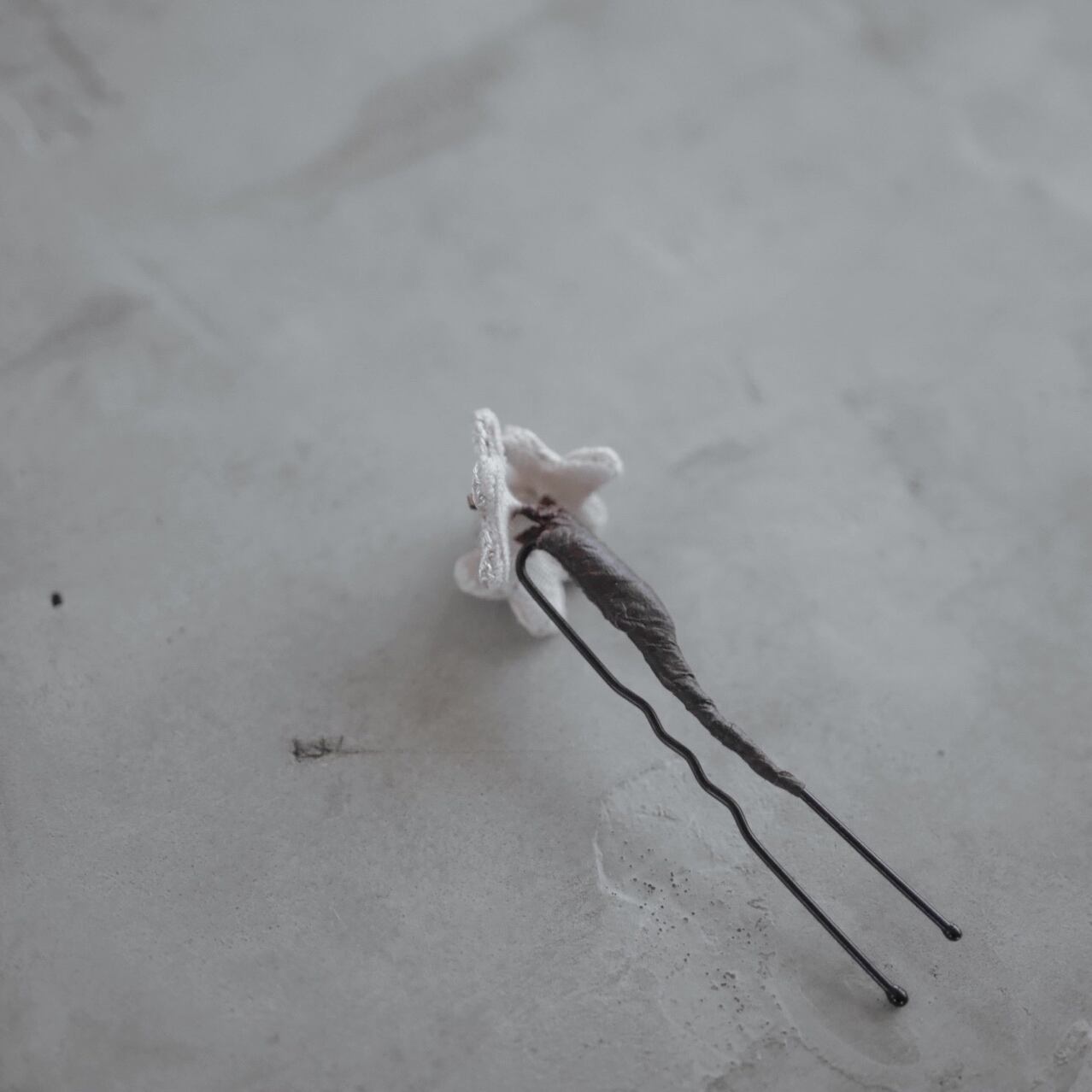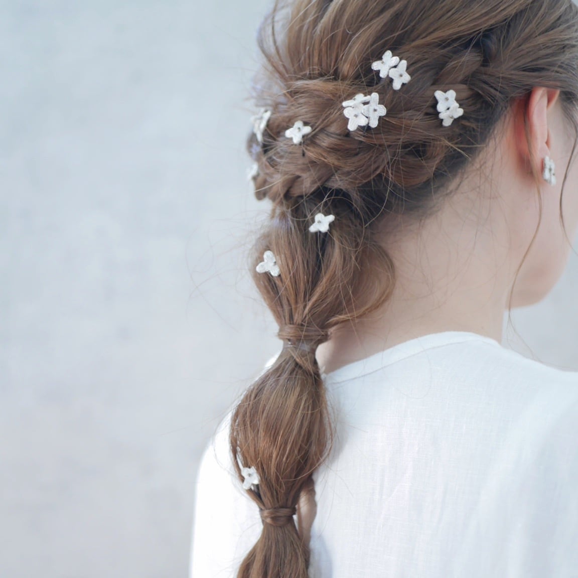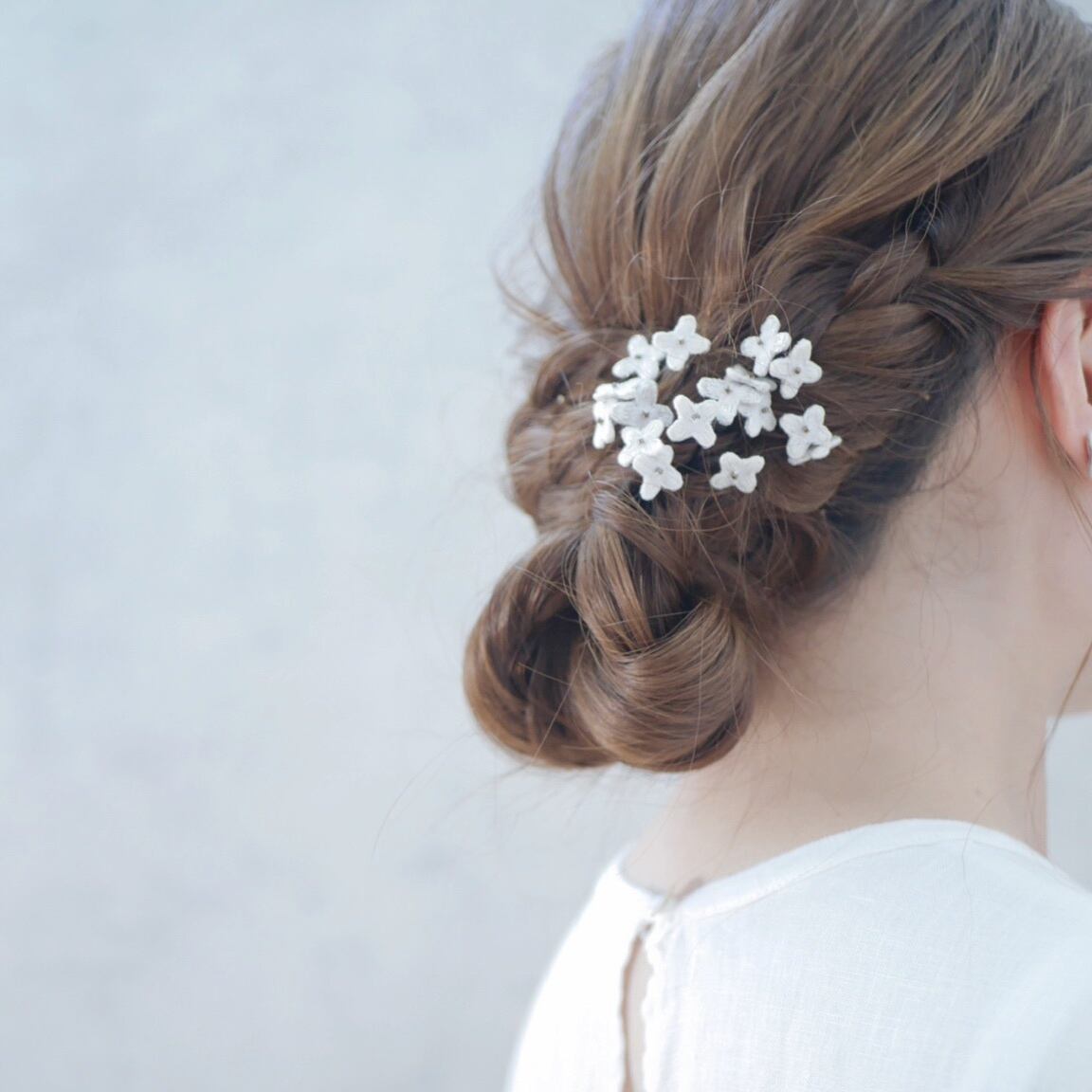 花モチーフが3つの束になったUピンや2つの束、1つ付いたUピンなどがあり、ヘアスタイルによってつける本数を調節していただけます。