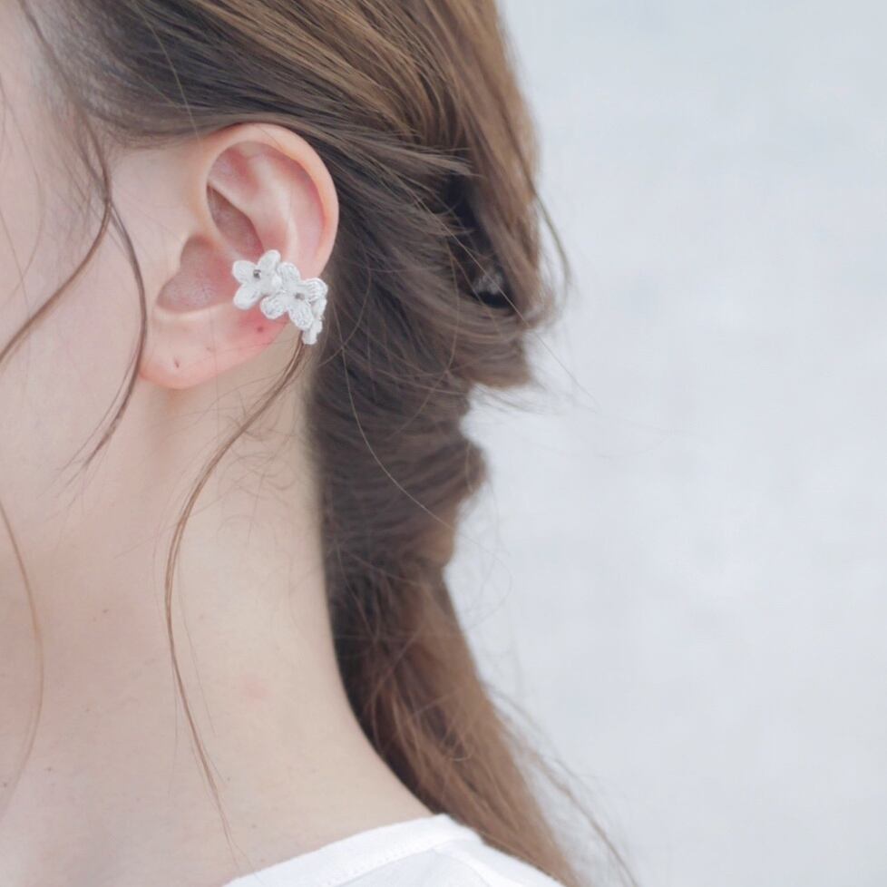 やさしいオフホワイトにシルバーがポイントになったイヤーカフは同色のシンプルなファッションに合わせるとナチュラルな雰囲気に、