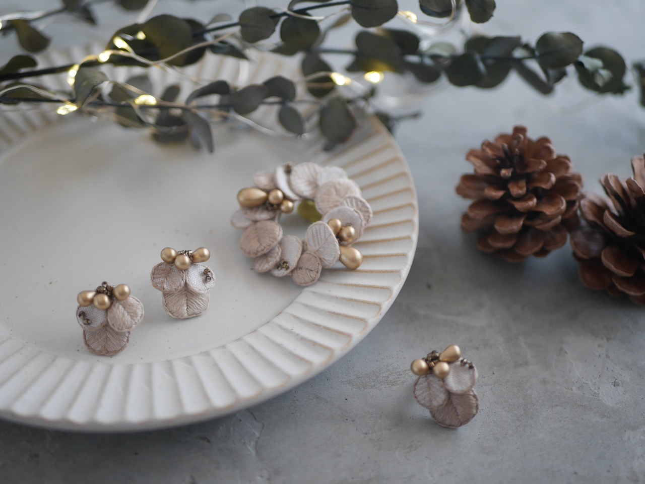 木の実をイメージしたビーズでクリスマスのオーナメントをイメージしながらアクセサリーに仕上げました。