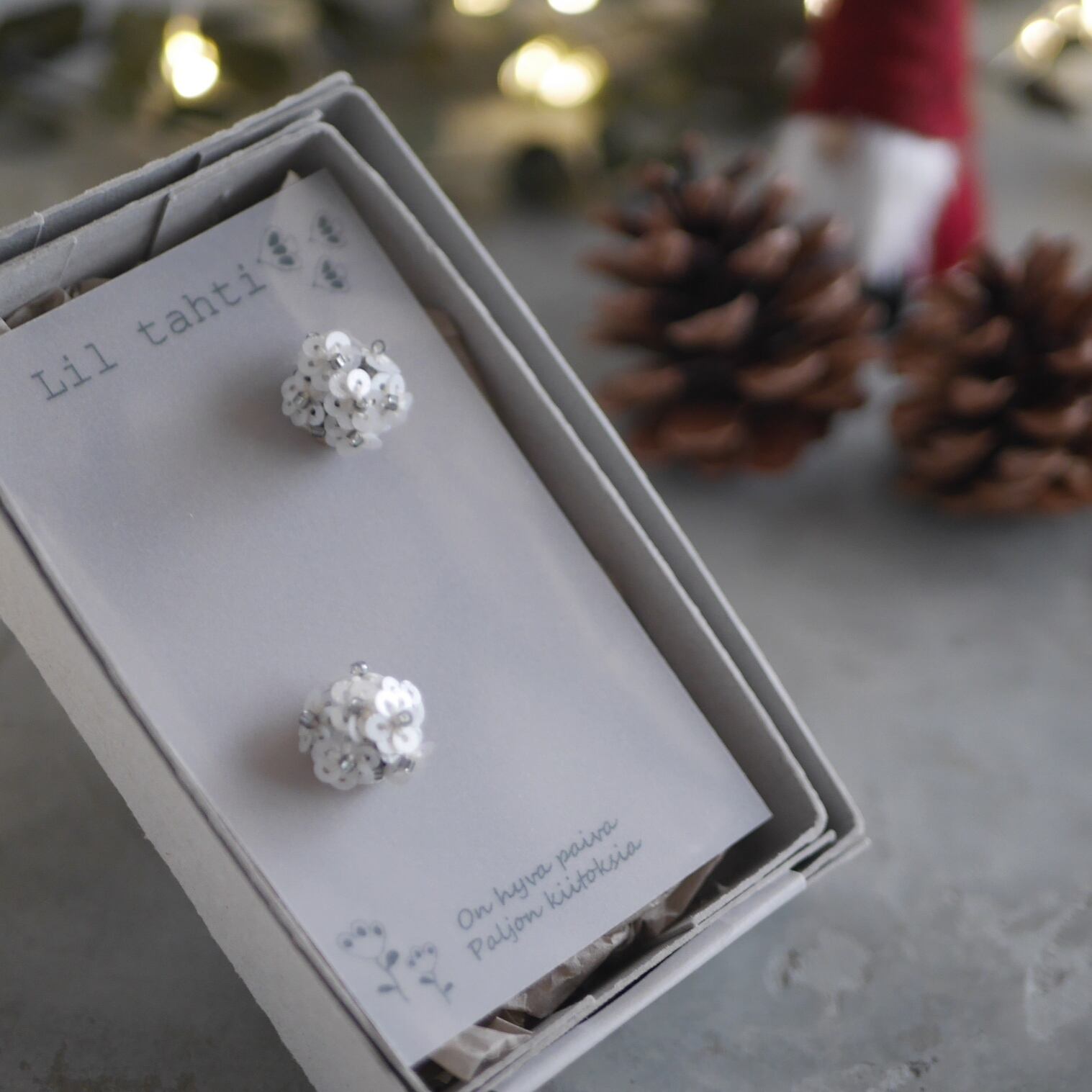 上品な光を放つマットな質感の白いスパンコールとシルバーのビーズで顔まわりを明るくしてくれるピアス/イヤリングです。