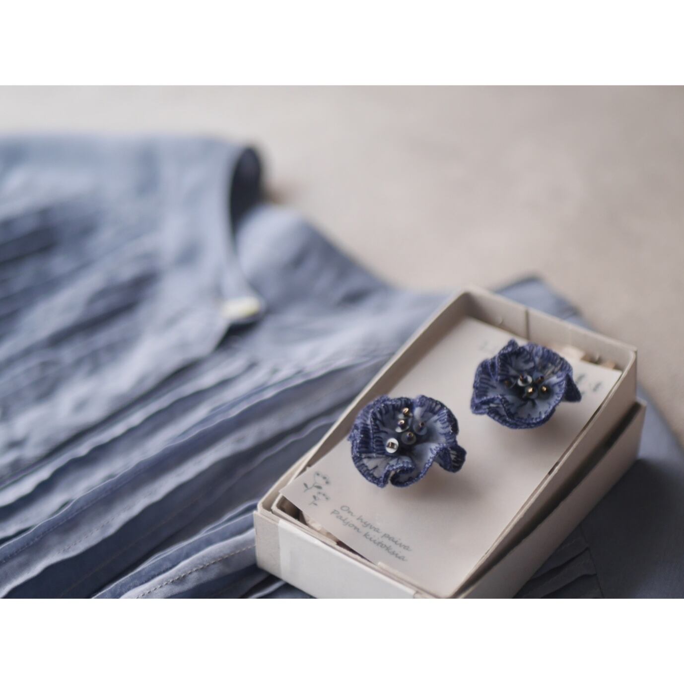 存在感のある大きさのピアス/イヤリングですが、ブルーグレーの生地とネイビーの刺繍糸で目立ちすぎず上品な印象です。